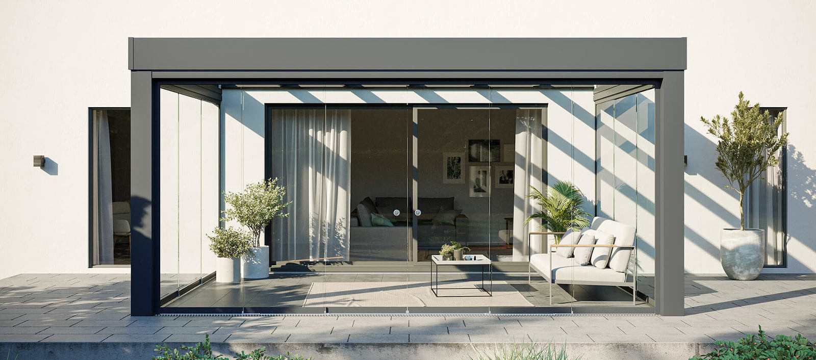 Cuando el mal tiempo ya no supone una gran diferencia: con un techo de terraza de SUNFLEX podrá disfrutar de su jardín durante todo el año. Ofrece protección contra la luz solar directa en días calurosos y protege de la lluvia en los días nublados. Gracias a las diferentes formas de techo y a las numerosas variantes de techo, los techos de terraza de SUNFLEX se pueden adaptar de manera óptima a su hogar y a sus necesidades.